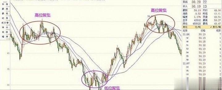 均线组合系统是由短期、中期、长期均线所组成,分别代表短期、中期、长期价格走势的表现形式,在一个区域内反复交错、汇聚的现象,是价格成本集中的反映,如果均线在连续下跌的低位出现聚集的现象,则是大行情上涨的征兆,反之高位聚集则要提高警惕,很可能是高位做头的信号,整体对市场表现为看空,看涨意愿表现疲软,当所有均线一旦向下发散,预示着中期下跌行情即将开始。如下图所示: