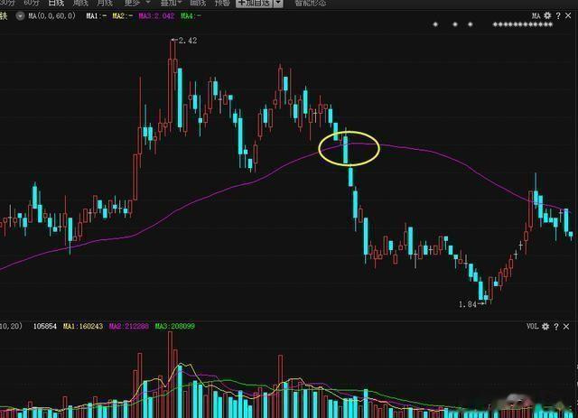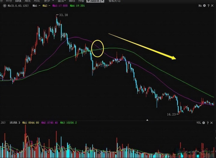 第三、如果缩量跌穿决策线,弱势反弹结束之后再次放量下跌,说明后市跌幅巨大。