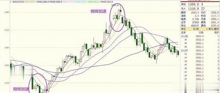 短线加速通常出现在趋势的末端,上升趋势当短期均线远离中长期均线时,行情进入最后的疯涨阶段,投资者应该做好减仓的准备;相反,下降趋势中,当短期均线远离中长期均线时,行情将进入最后的暴跌及衰竭阶段,会产生物极必反发,此时价格会容易产生反弹,投资者应该做好空单的下跌减仓及短线抄底的机会,如下图所示: